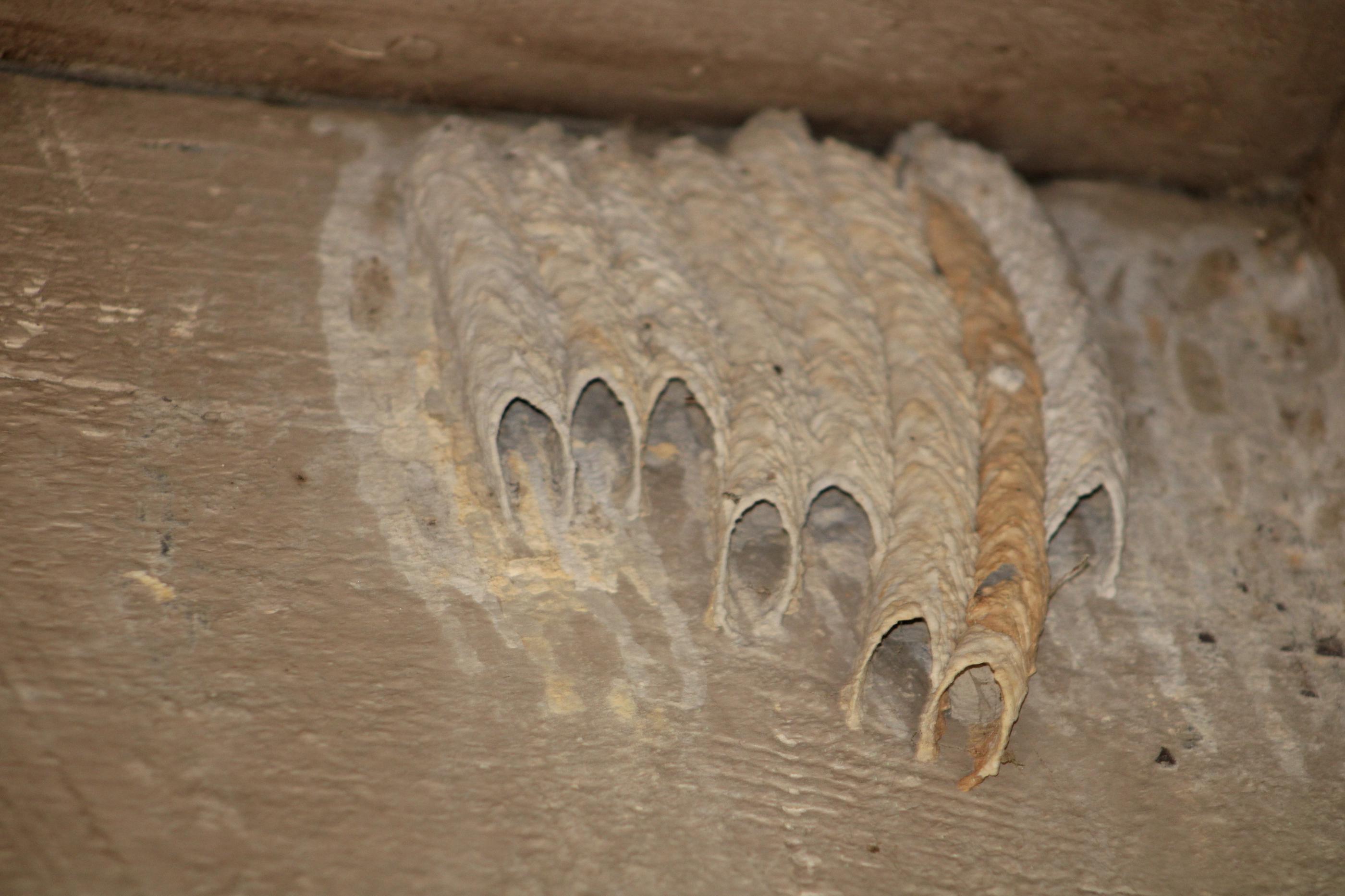 You may have a paper wasp nest if you see exposed nests with lots of honeycomb-shaped cells. Some people say paper wasp nests resemble upside-down umbrellas as they hang from a single stalk.